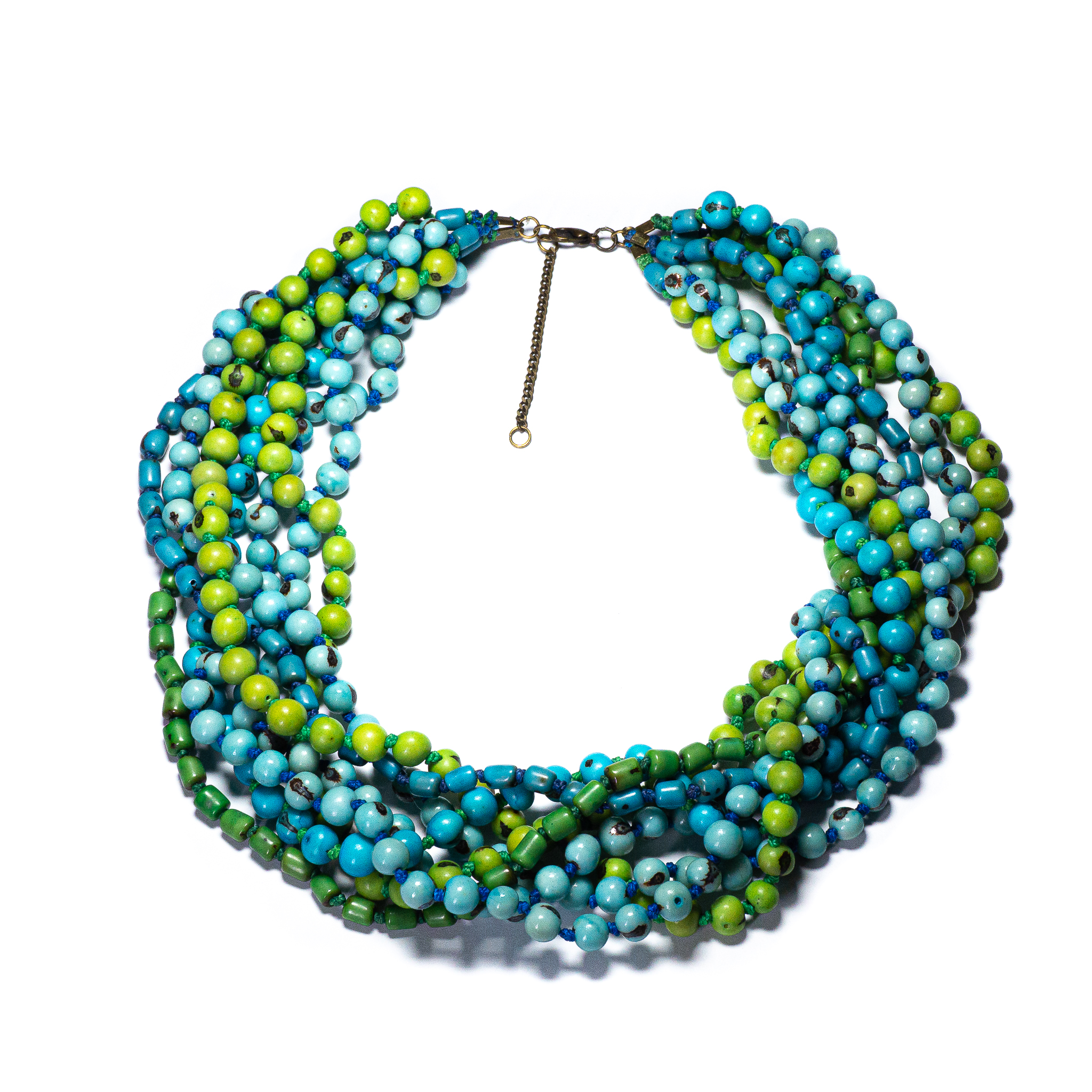 Colar de comprimento médio com 8 voltas de açaí em tons de verde e azul. Com nozinhos semente a semente para um melhor caimento.